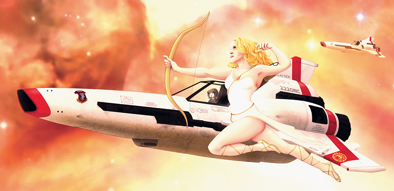A tribute to Glen Angus (rest in peace) whos series of paintings called "Victory Gals" inspired me and a tribute to my favorite television series (and the best story ever told) Battlestar Galactica. This particular painting represents the return of Kara "Starbuck" Thrace from the dead - reborn as an angel. She is wearing a toga and using bow with arrows of Apollo as her weapon to fight her enemy, because the whole BSG saga was based on Greek mythology, so Kara also represents the Greek goddess Artemis, who also hunted with a bow and arrows. Im considering painting the whole series...Boomer with a cylon raider, Caprica with heavy raider, Dualla with raptor...and one that would be in the middle of all these 4 - Starbuck falling in to the eye of Jupiter but being held by two angels on each side - Baltar and Caprica.